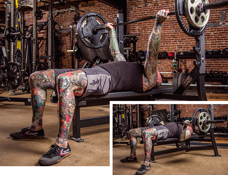 When you lower the bar from the up position, don’t bring it down to your chest or to your nipples like you would with a standard bench press. The bar should actually touch down below your chest. The line of your lower pecs, where the upper abs are, is about where you should come down to, if not even a bit lower on your abs.